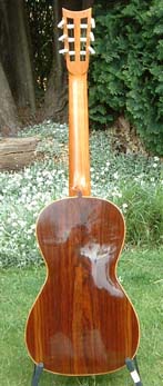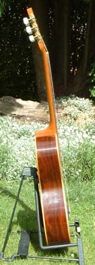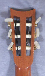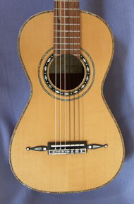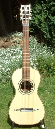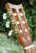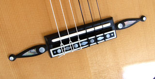 The bridge on an original Panormo has pins and a fixed saddle. My version has a bone saddle and six tie holes.